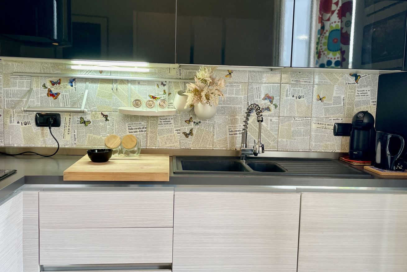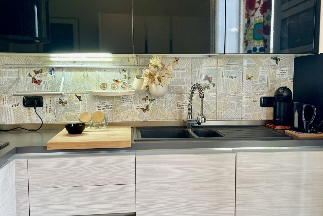 La zona living con divano e TV è perfetta per serate in compagnia, mentre la cucina a vista – funzionale e ben organizzata – dialoga con la zona pranzo fino a 6 persone, creando un ambiente fluido e armonioso.
