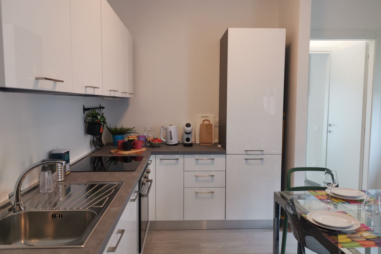 La cucina è dotata di tutto il necessario per cucinare: piano cottura a induzione, frigorifero con congelatore, lavastoviglie, macchina del caffè, bollitore e un set completo di pentole, padelle e stoviglie.