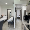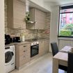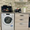 La zona giorno è luminosa e accogliente, con una cucina completamente attrezzata che include piano ad induzione, lavastoviglie, forno, forno a microonde, macchina per il caffè e lavatrice per garantire un soggiorno confortevole.
